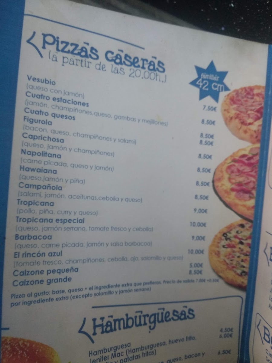 Welcome to restaurante El Rincon Azul, a hidden gem nestled in Vicalvaro, Madrid. Known for its varied menu, this charming eatery specializes in delightful pizzas that have garnered positive acclaim from patrons, like Marta LS, who praised their exceptional taste. The inviting ambiance, coupled with the rich flavors of each dish, makes it an ideal spot for both casual dinners and family gatherings.